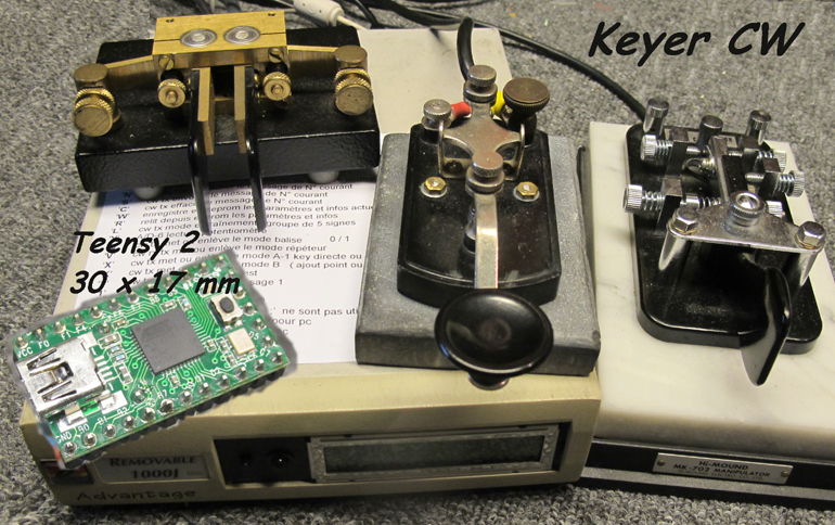 Dominique F5BEZ proposait en 2011 une réalisation utilisant un micro contrôleur Atmel Teensy 2 , petit mais puissant… Cette application regroupe de nombreuses fonctionnalités CW en autonome avec un afficheur LCD ou en liaison USB avec un PC. On y trouve un filtre à PLL, des fonctions de réception et de décodage adaptatif, des fonctions Keyer avec mémoires, un générateur de mots pour l’entraînement, une fonction balise et répondeur. De nombreuses commandes et réglages se font en CW avec un seul bouton ‘ smart key ’ ou depuis un PC. La réalisation est simple et nécessite peu de composants. Le dossier est très bien documenté et didactique. Les sources C .zip sont disponibles pour un usage libre radioamateur, et vous permettent de tester et de ‘ maniper ‘ autour de ce sujet.