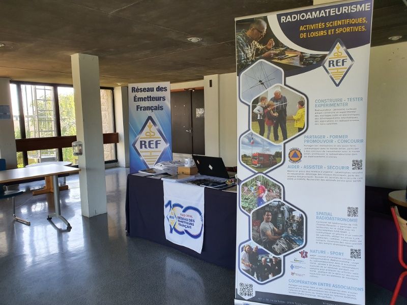 Ce fut aussi le moment de tester la station portable de David F4LTV qui l’avait installée en extérieur devant l’amphi. Il a pu ainsi établir des contacts radioamateurs dans le monde via le répéteur nommé QO100 positionné dans un satellite géostationnaire de télécommunication du QATAR.
